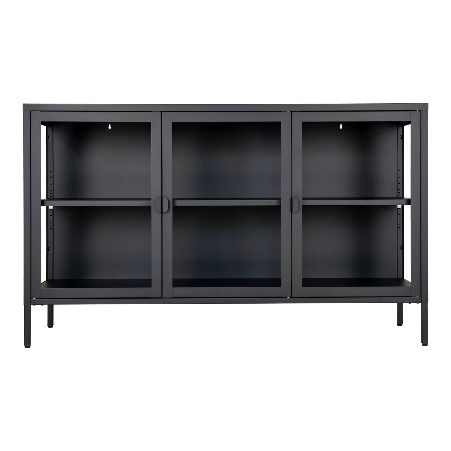 Med sin elegante sorte finish vil denne skænk med glaslåger tilføje en sofistikeret touch til enhver indretning. Det slanke design og det gennemsigtige glas skaber et luftigt og rummeligt udseende, der vil forbedre ethvert rum.