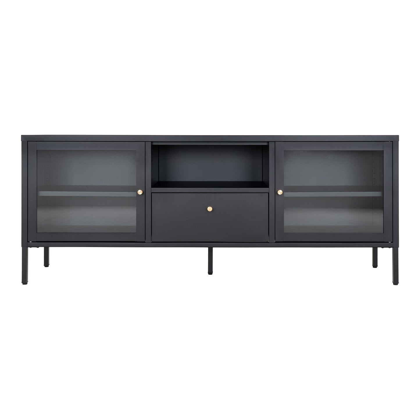 Opgrader dit hjemmets underholdningsområde med Dalby TV-Bænk - en moderne og stilfuld løsning til dit TV-udstyr. Denne sorte TV-bænk er udstyret med glaslåger og en praktisk skuffe, der giver dig mulighed for at organisere og opbevare dine elektroniske enheder og tilbehør på en elegant måde.