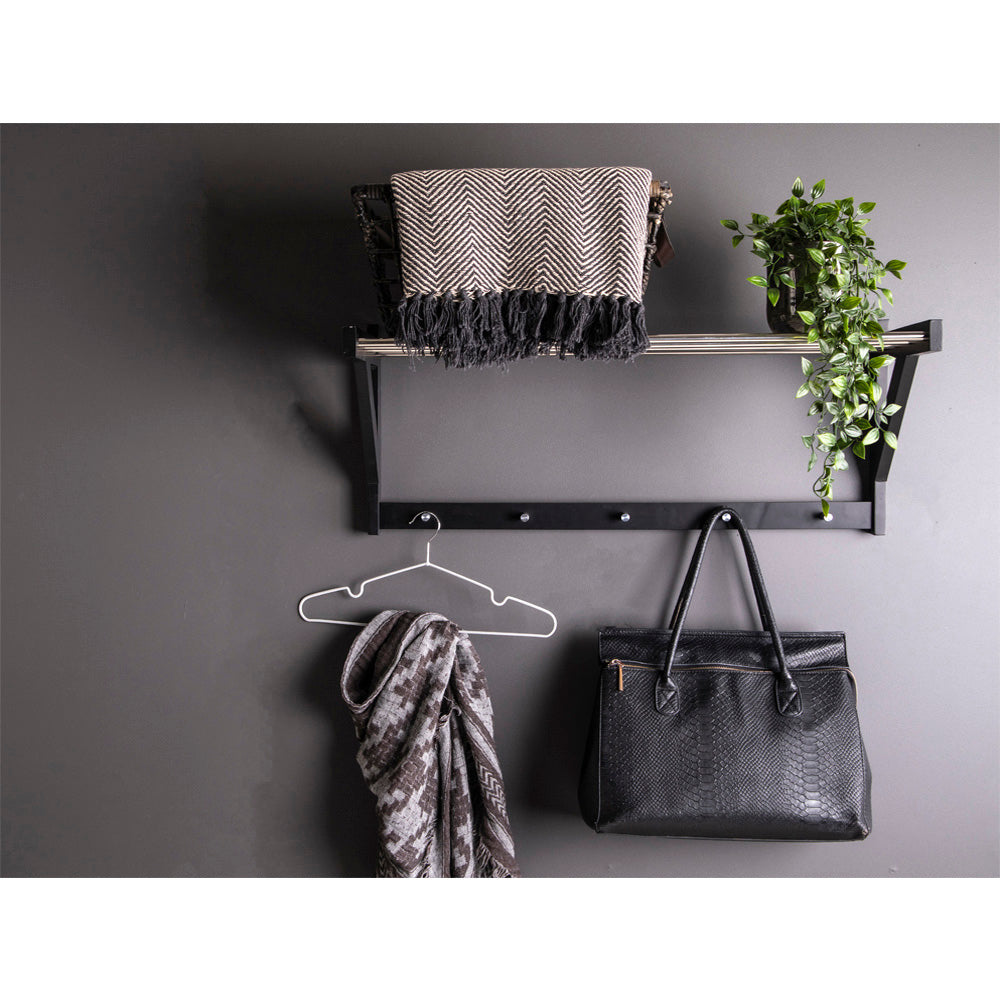 Sort træ og stål er ikke kun to smukke materialer, men de tilføjer også en følelse af holdbarhed og kvalitet til denne hattehylde. Træet tilføjer en naturlig varme og elegance, mens stålet giver et moderne og industrielt touch. Kombinationen af disse to materialer skaber en unik og iøjnefaldende design, der vil tiltrække opmærksomhed fra enhver besøgende i dit hjem.